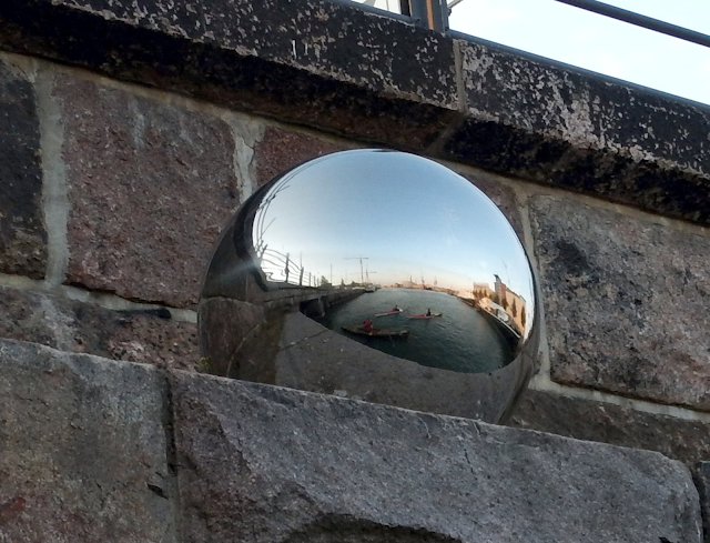 Rantamuurin kuulasta heijastuu melojia Hietalahden altaassa. |
